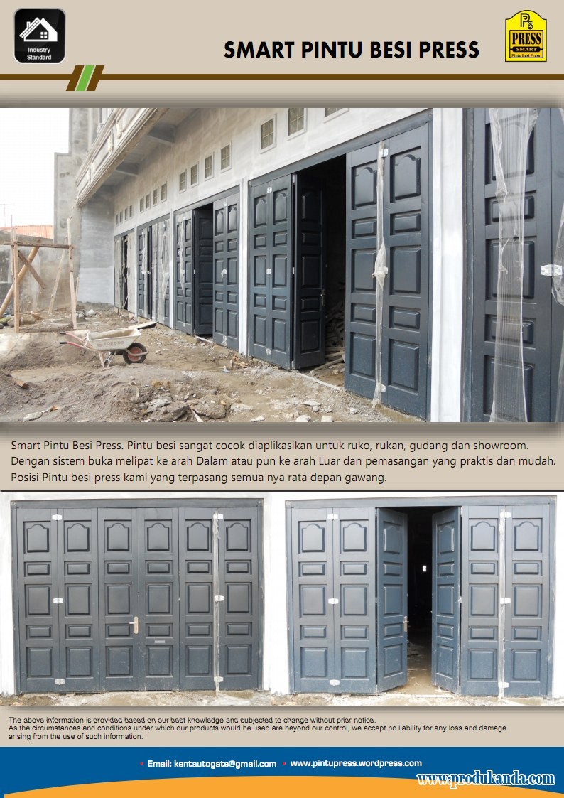 Dengan mengikuti perkembangan trend dan Consumer Need ,apa yang lebih banyak diinginkan dan di minati oleh masyarakat, maka kami hadir dengan Pintu Besi Press dengan menggunakan sistem melipat dengan model pintu kayu dengan finishing power coating. Sistem pemasangan pintu besi press sistem melipat kami lebih kuat dan mudah dalam hal perawatan dan efesien. Pintu Besi Press kami berbahan dasar plat besi dengan proses tekuk,bending dan finishing powder coating dengan teknologi terkini didukung dengan peralatan canggih dalam pemenuhan perkembangan tekhnologi perpintuan dewasa ini.